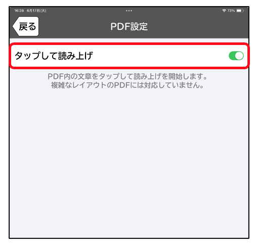ONにすると、PDFモードの画面で、リフローモードに変換することができます。